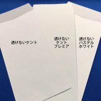 透けない封筒の白さの違いについて 【透けないケント】は内面のグレー特殊加工のため、若干グレーっぽく見えます。 【透けないケントプレミア】はグレーの特殊加工が無く自然な白さです。 【透けないパステルホワイト】は内面のグレー特殊加工と表面の鮮やかな白さで美しい白さがあります。